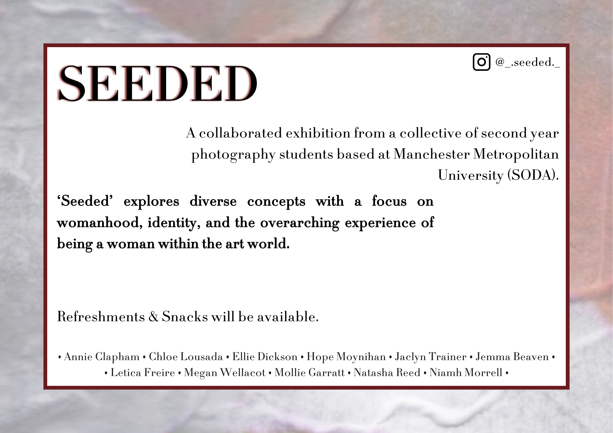 A female led collaborative group exhibition ‘Seeded’ showcased works of 11 women, in which explored themes of womanhood and the art world.